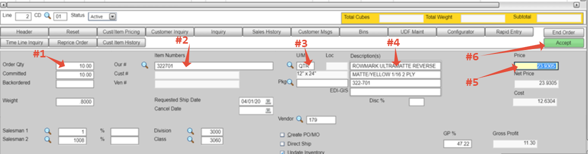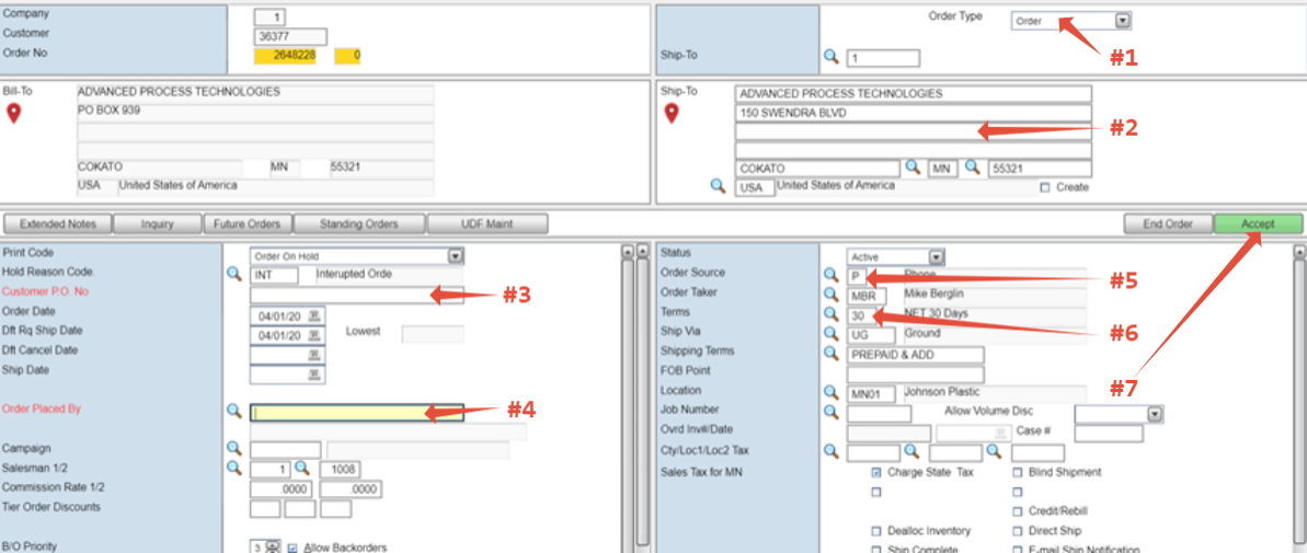 - Click "Accept" to go to the next screen (Order Entry/Update Screen )